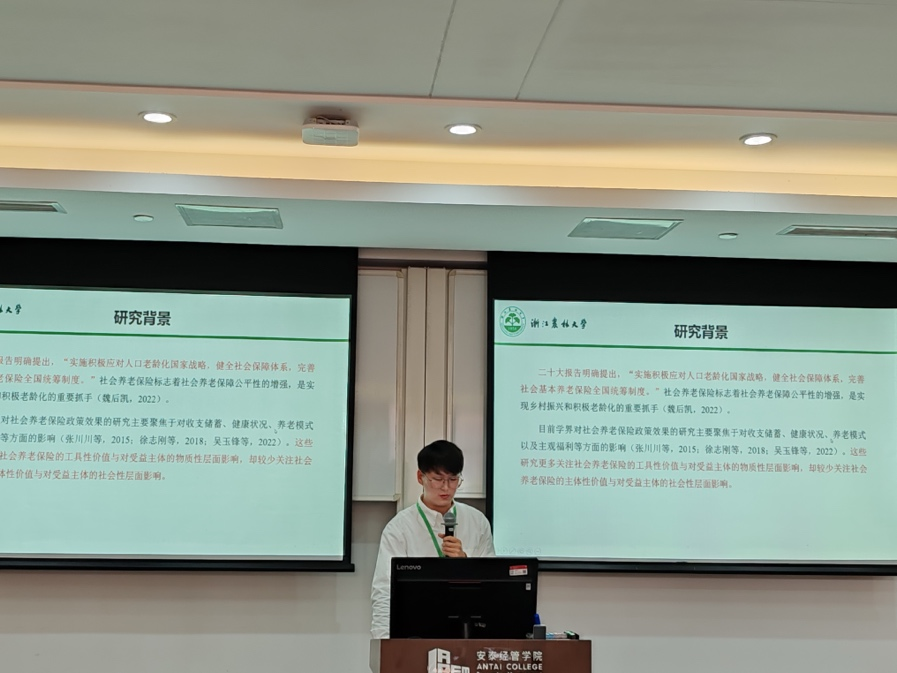 2021级农业管理硕士研究生吕良瑞和2023级农业经济管理硕士研究生许江帆分别就《社会养老保险对农村老年人社会适应的影响—基于中国老年社会追踪调查的实证研究》和《粮食安全背景下农业化学投入品减量的生态补偿标准研究—基于作物差异的分析》在“分论坛五:老龄化、教育与健康”和“分论坛四:绿色与低碳”分会场中进行主题演讲,其中许江帆同学担任分论坛下半场主持。本次论坛由院长助理杨建辉副教授带队,并在 “分论坛二:数字经济”分会场中担任点评专家。参加本次论坛,展现了51吃瓜