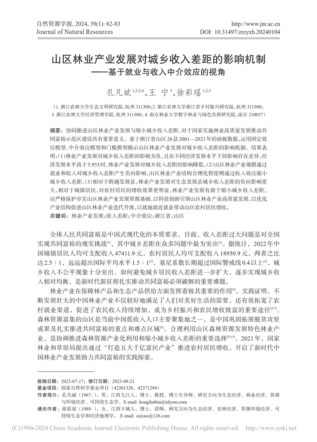 徐彩瑶副教授(通讯作者)、孔凡斌教授(第一作者),以及农林经济管理学2021年级硕士生王宁共同撰写的论文《山区林业产业发展对城乡收入差距的影响机制——基于就业和收入中介效应的视角》在《自然资源学报》(浙大一级、CSSCI)2024年第1期上发表。该论文是孔凡斌教授和徐彩瑶副教授主持承担的国家自然科学项目的阶段性研究成果。