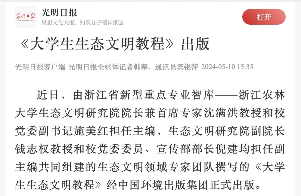 5月10日,光明日报客户端报道《大学生生态文明教程》正式出版,该专著由沈满洪教授和校党委副书记施美红担任主编,钱志权教授和校党委委员、宣传部部长倪建均担任副主编组建的生态文明领域专家团队共同撰写完成,经中国环境出版集团正式出版。