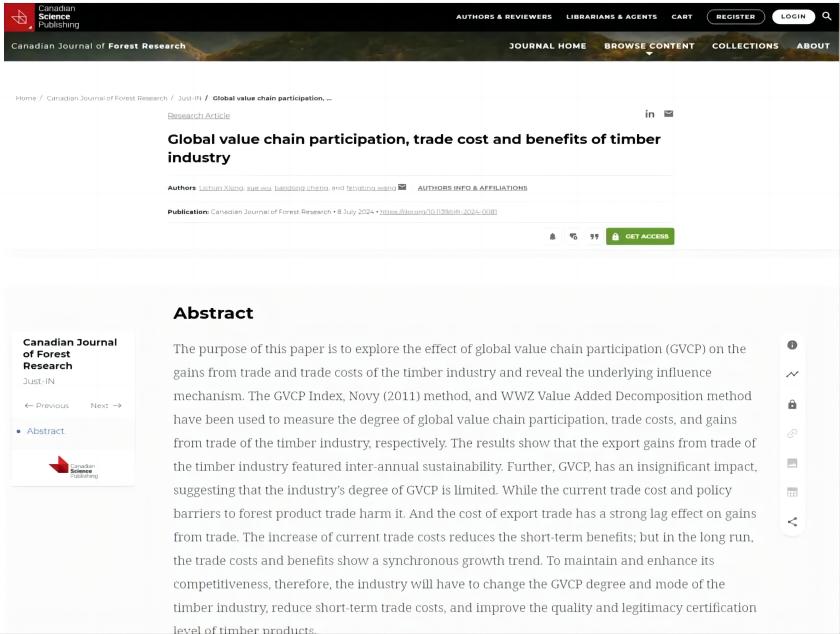 近日,熊立春副教授撰写的论文《Global value chain participation, trade cost and benefits of timber industry》在线发表在林学(含林业经济学)领域重要期刊《Canadian Journal of Forest Research》(加拿大林业研究杂志),熊立春副教授为论文第一作者,北京林业大学国家林草经贸研究院院长程宝栋教授和51吃瓜